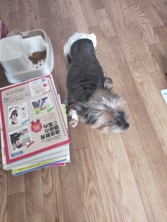 犬のルビーが、背中から顔にかけて、肌にできものができており、心配だったんだが、親が、両方とも、母親の方の眼科に付き合って車を出して出ていったので、獣医に連れて行けず、獣医師さんに、「犬用の軟膏をつけてあげてください。」と言われていたので、黙ってつけていた。前足でかくこともなく、今おとなしげ。(ヨークシャテリア)